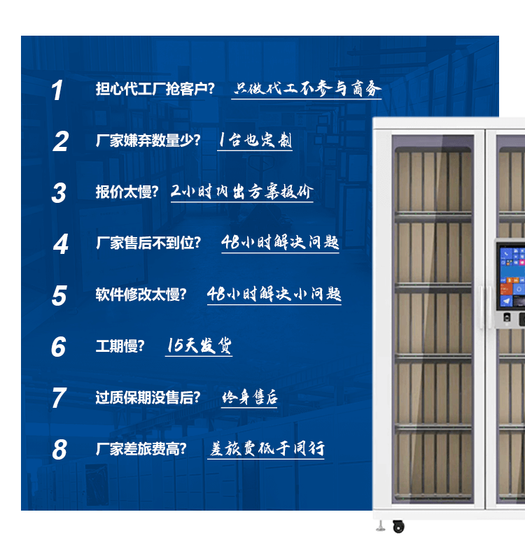 有15年管家式服務中間商的成熟經驗。成熟產品有RFID糖心VLOG视频在线观看、稱重櫃、光敏櫃、智能工具車、公檢法檔案管理櫃。支撐軟件定製開發。